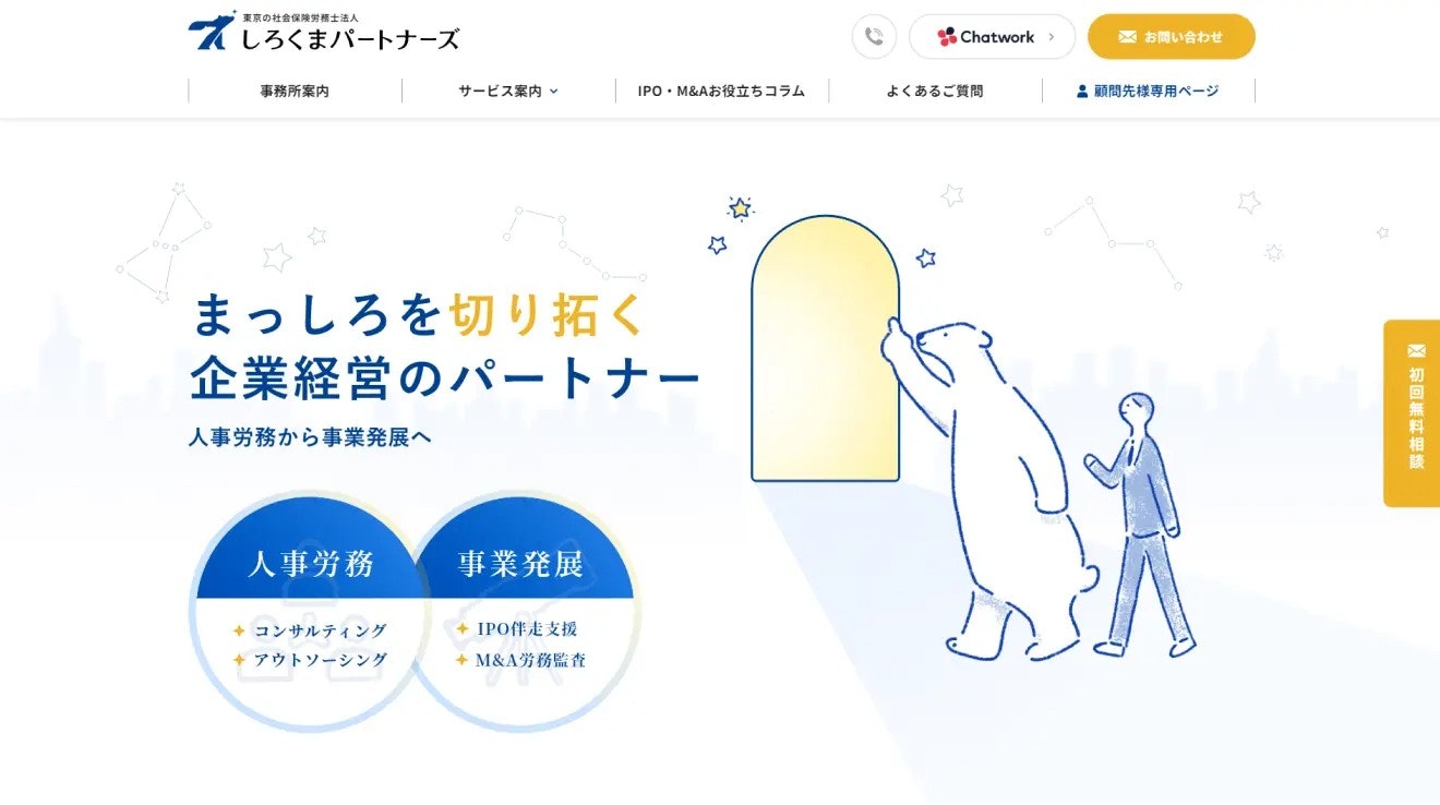 IPOとM&Aの労務監査を強く打ち出し、「しろくまパートナーズ」の印象から、優しく大きく支えるデザインに反映し、詳細なサービス内容からは、優しさと高い専門性が感じられるサイトにしました。