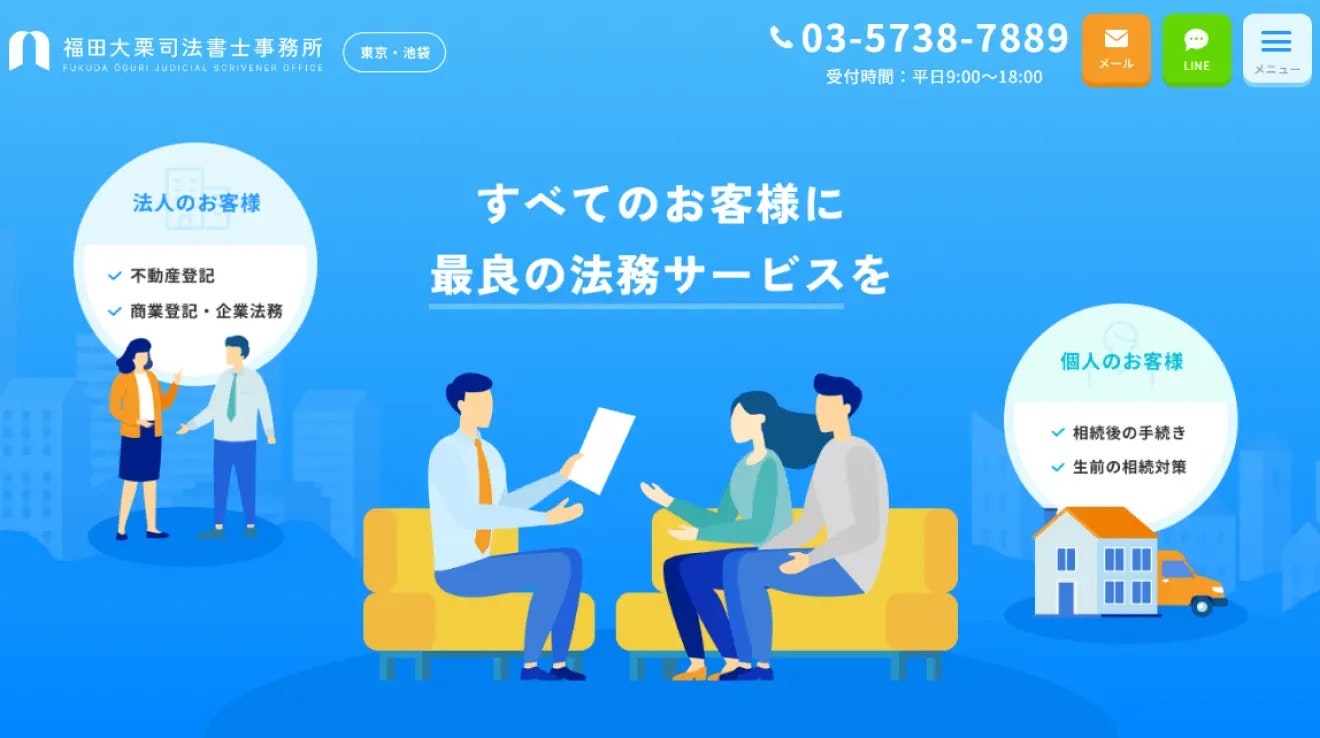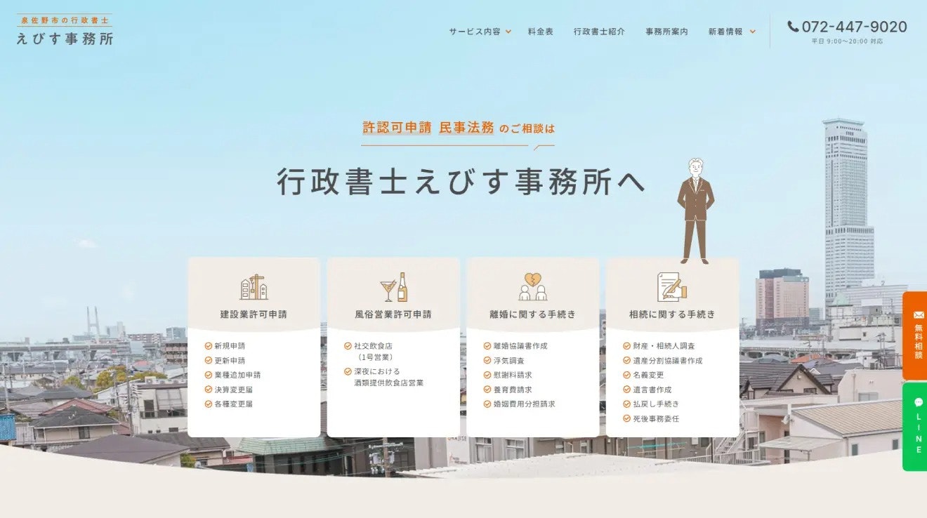 「泉州地域で一番親身に対応する行政書士」をコンセプトに、堅いイメージを払拭するため柔らかいイラストを用い、地域に溶け込み暮らしの相談窓口である印象が伝わるサイトを目指しました。