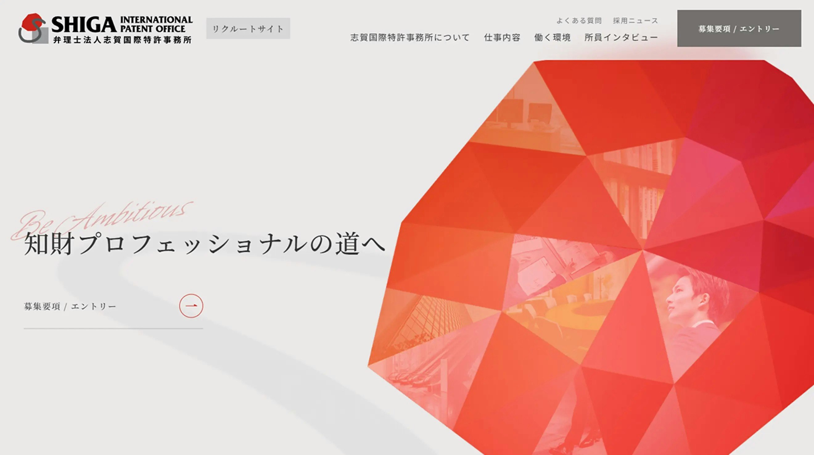 日本最大規模の特許事務所としてのスケール感を表現しつつ、余白や所員の写真を活用し、落ち着きとプロ意識が伝わるデザインを意識しました。