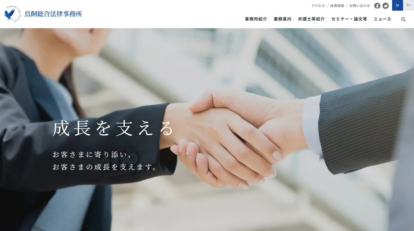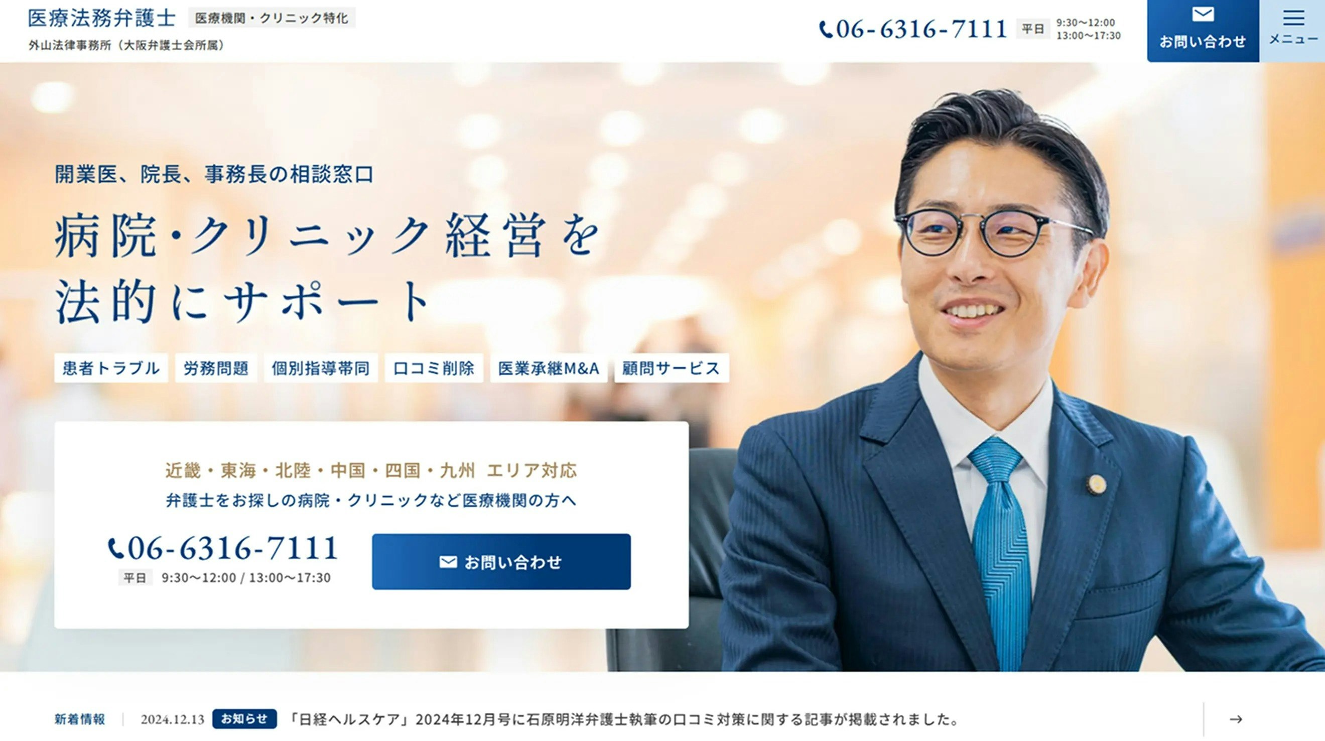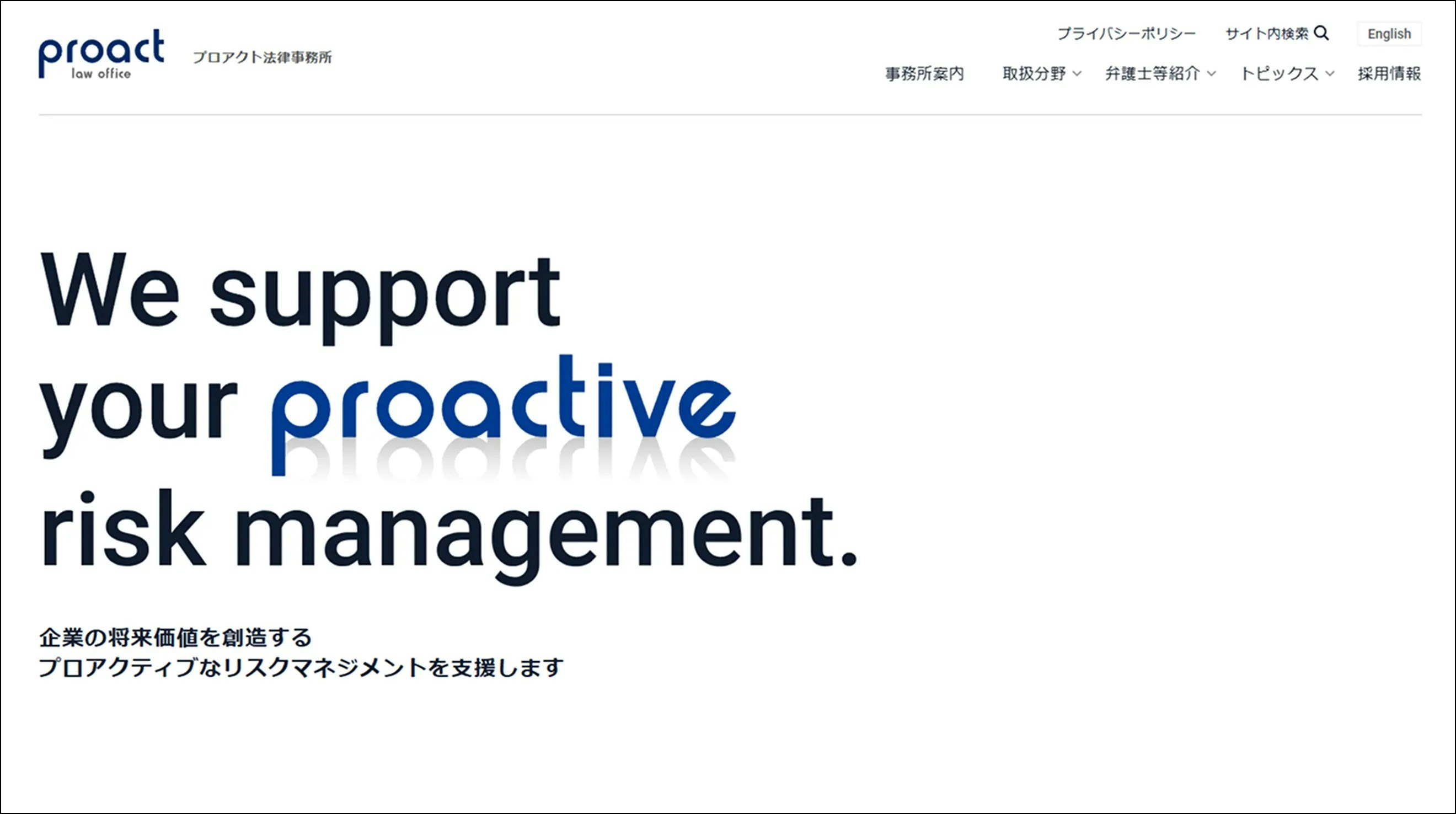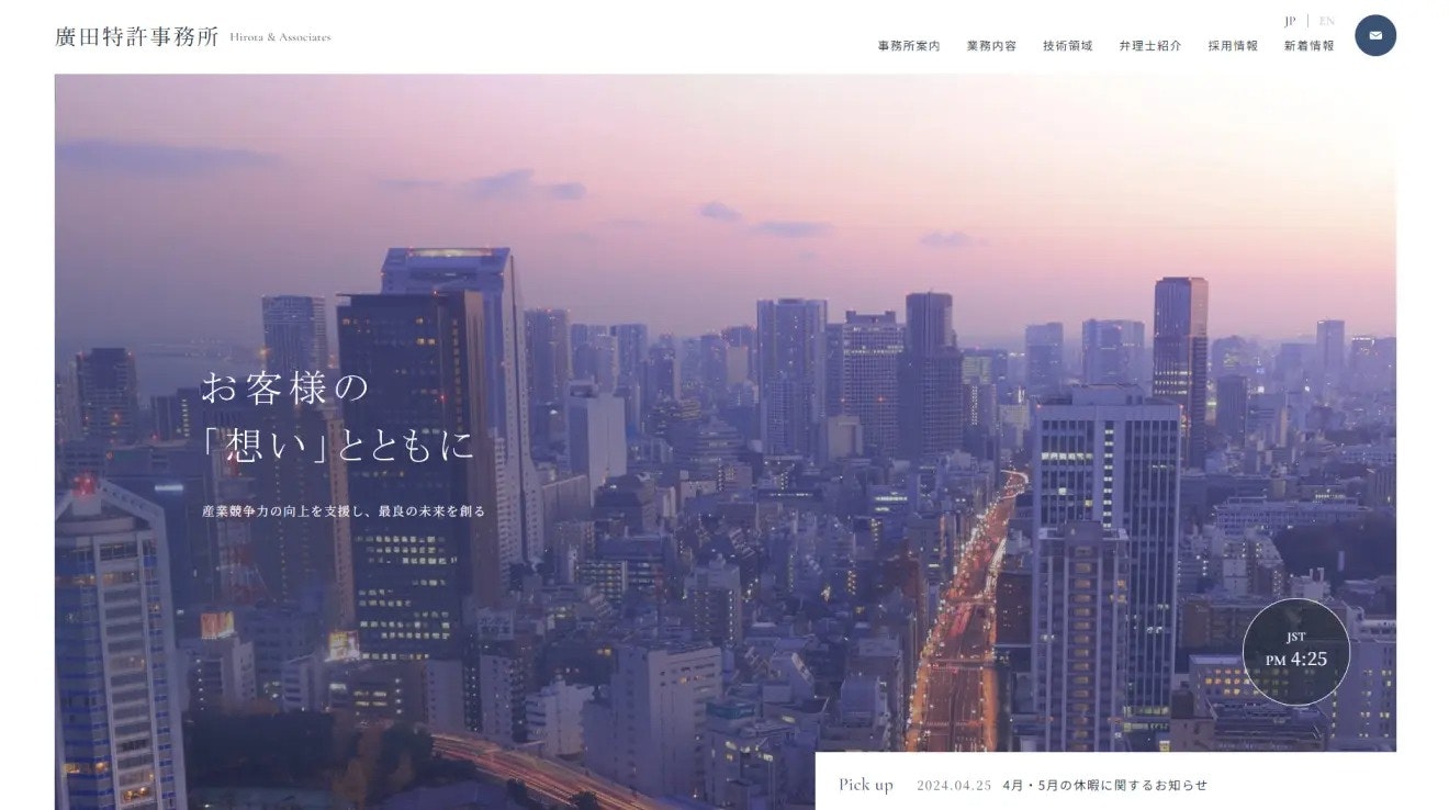 フォントサイズにメリハリをつけて先進的な印象を演出し、メインビジュアル下に専門性と鮮度の高い情報発信コンテンツを配置することで、事務所の専門性とブランド力が伝わるサイトにしました。