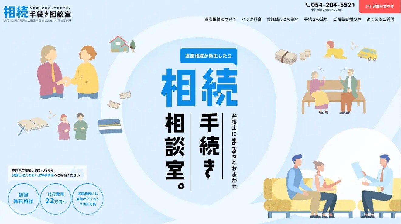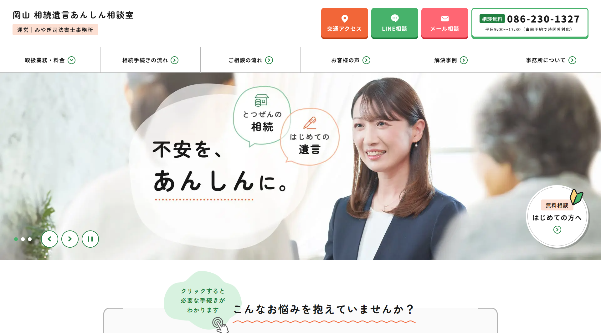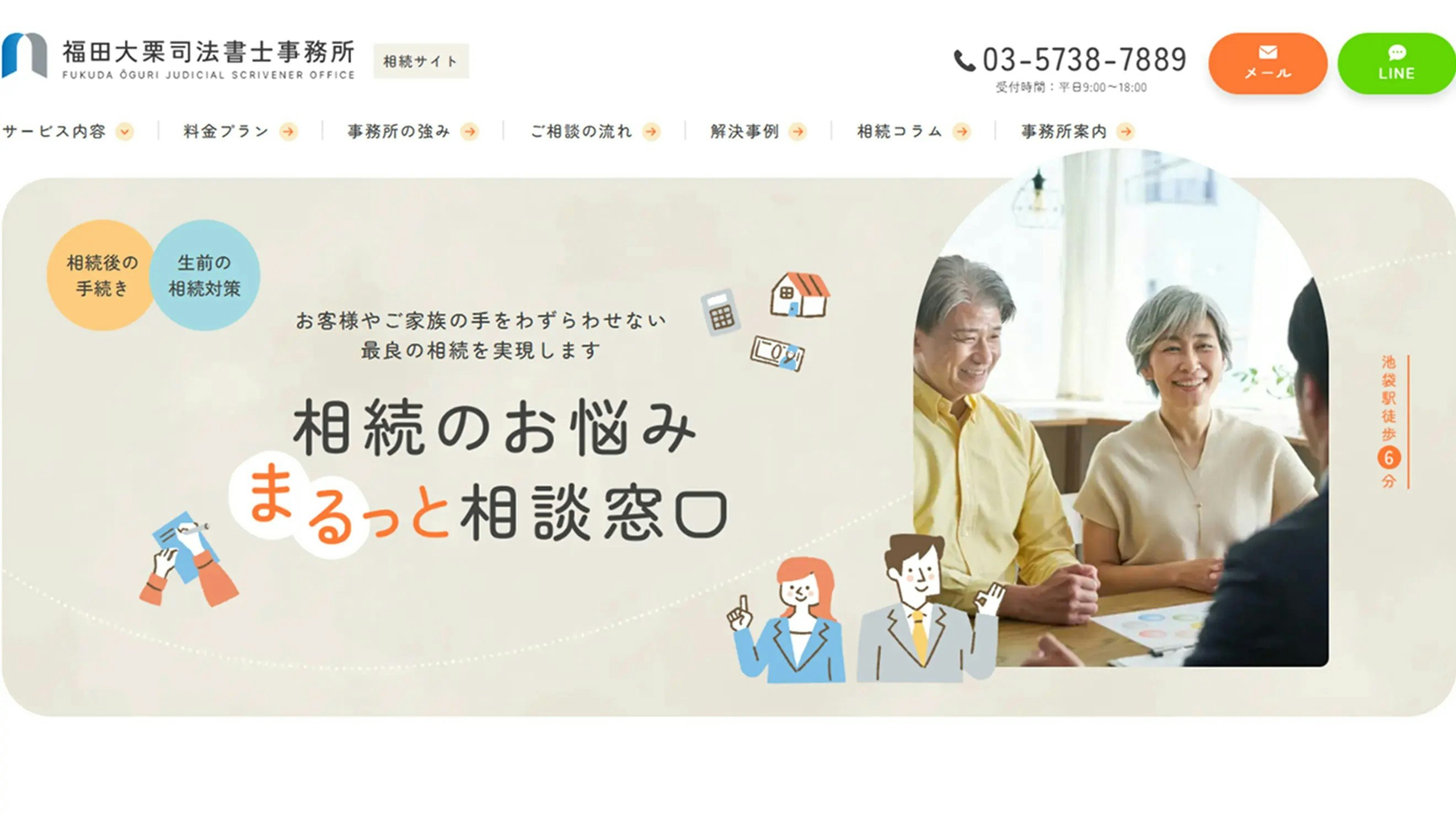 相続・遺言手続きが初めてのユーザーに向けて、親しみと安心感の伝わるデザインと、不動産にも対応できる高い専門性を押し出し、相続に関するあらゆる相談ができることが伝わるサイトにしました。