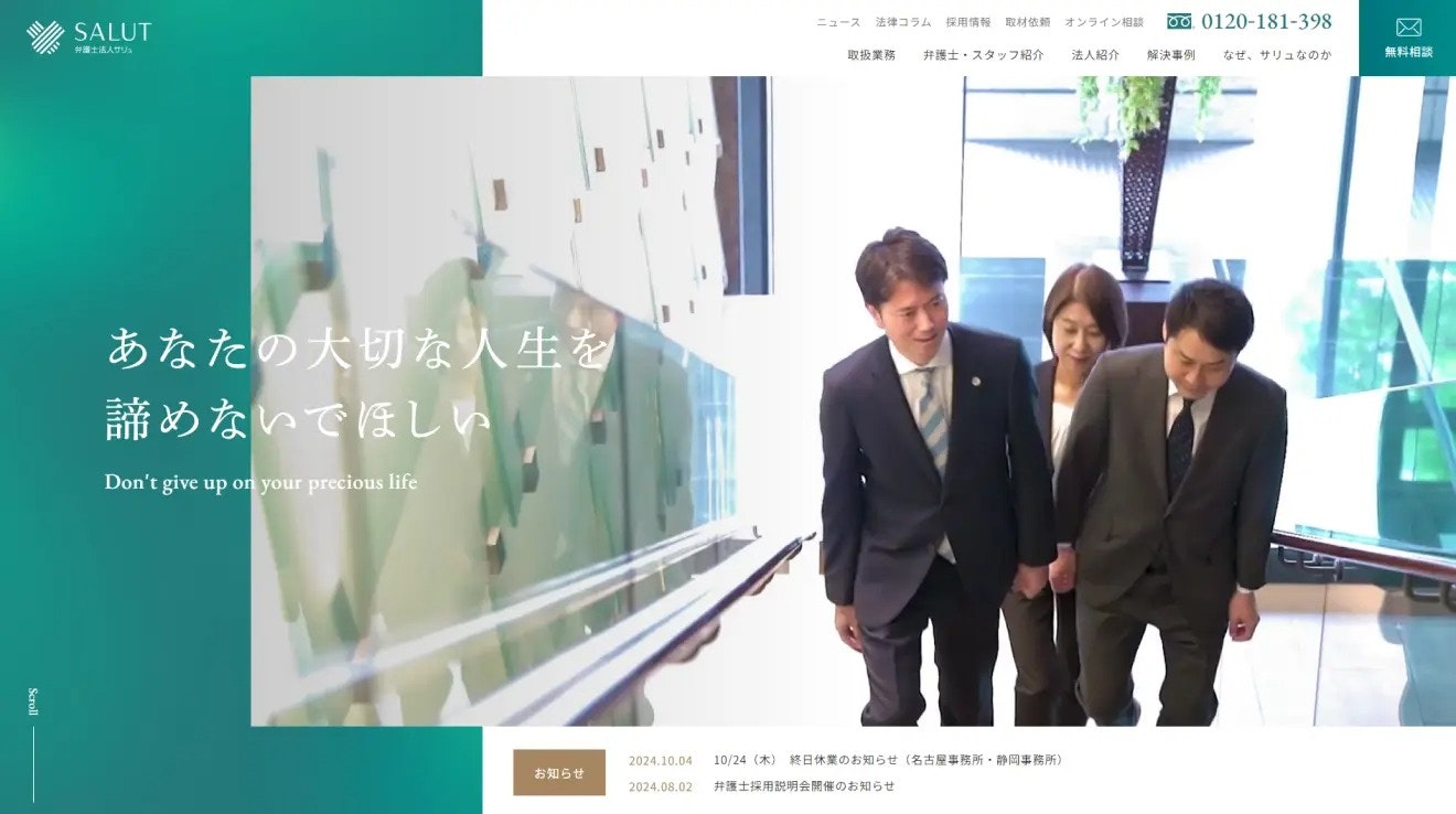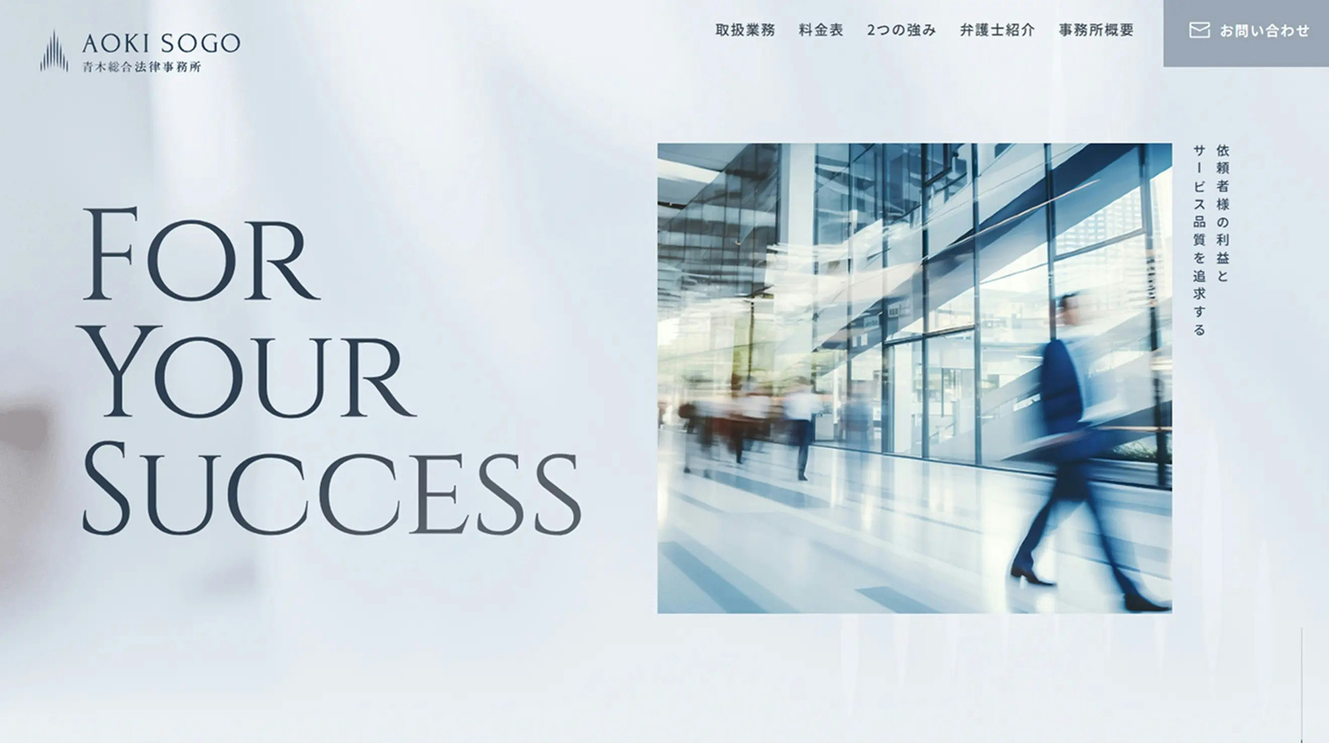 TOPに明確な料金表を掲載することでユーザーの利益を最優先に妥協しないサービスであることを強調し、事務所の強みをモダンで落ち着いたトーンによりプロ意識が伝わるサイトを目指しました。