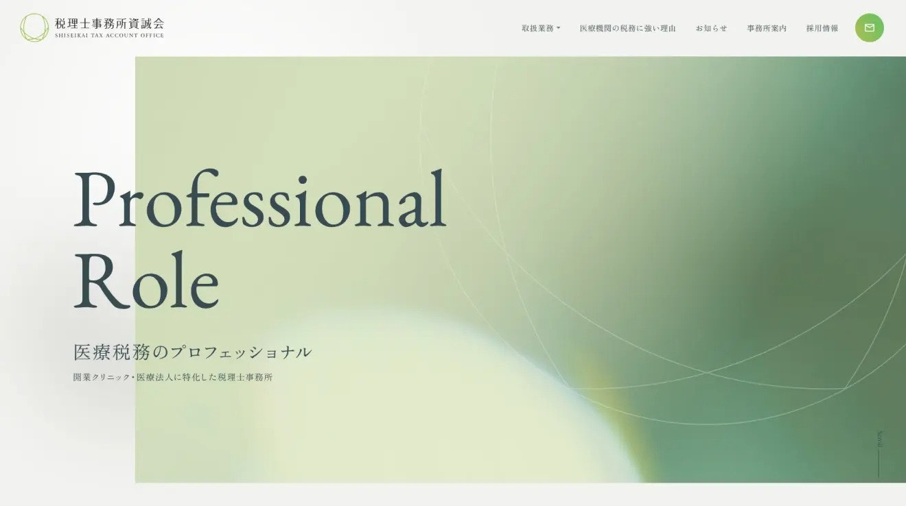 医業に関する専門性を持つ税理士に相談したいユーザーに向け、洗練された光を用いたデザインは、事務所の誠実さと最高品質の支援が伝わるように意識しました。