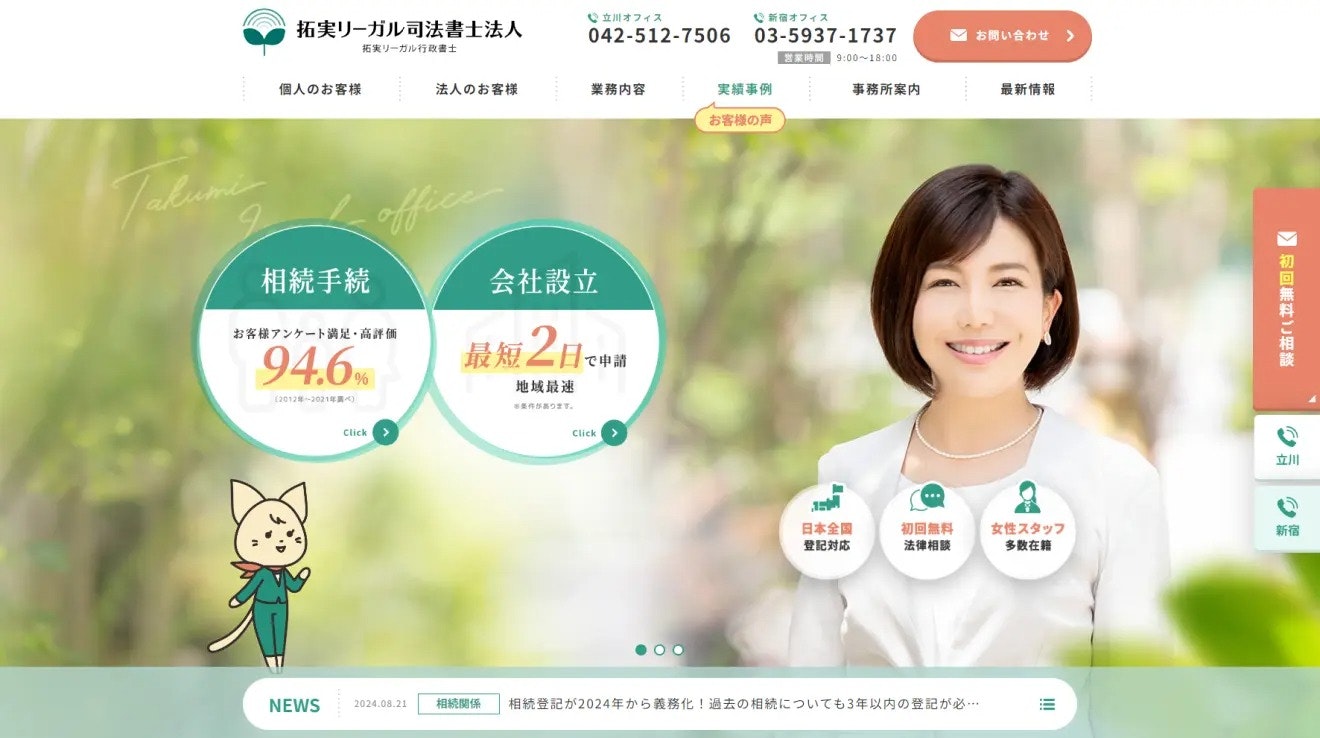 「個人から法人まで、質の高い法務サービスを提供する司法書士」をコンセプトに、15年の歴史と1,000件以上の登記実績を強みに押し出し、信頼できるサイトを目指しました。
