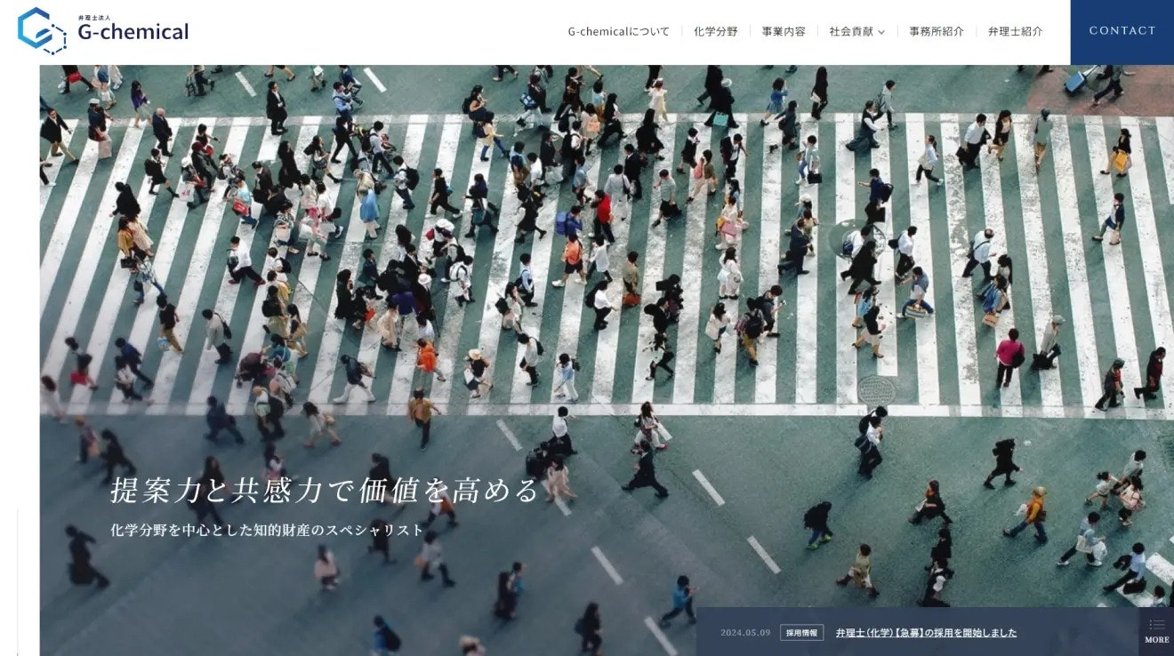 化学分野と人材育成の2軸を強調し、化学分野における25年の知識を詳細に記載しました。これにより、高い専門性と次世代知財人材の育成への取り組みが伝わるサイトにしました。