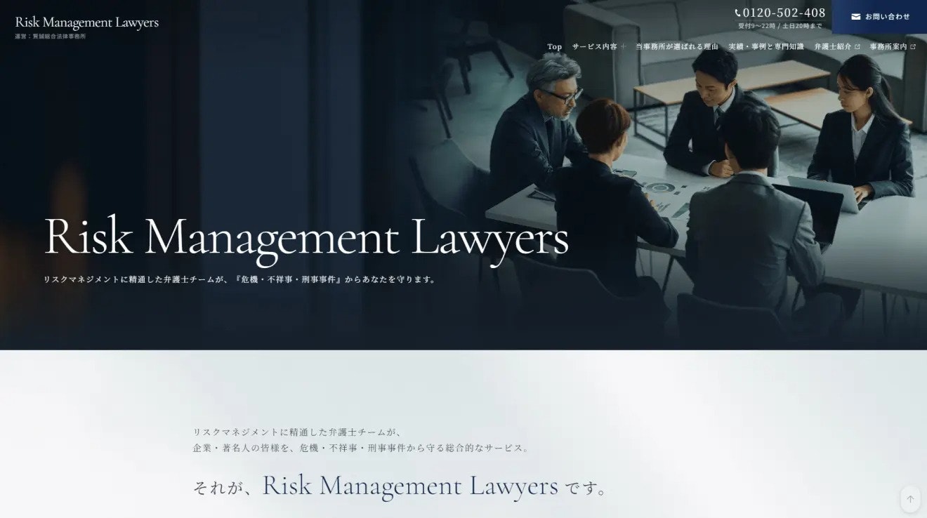 通常の企業法務だけでなく、警察対応、訴訟対応、メディア対応まで幅広く対応できる弁護士チームの特長を活かし、詳細な説明とシンプルな配色で高い専門性が伝わるサイトにしました。