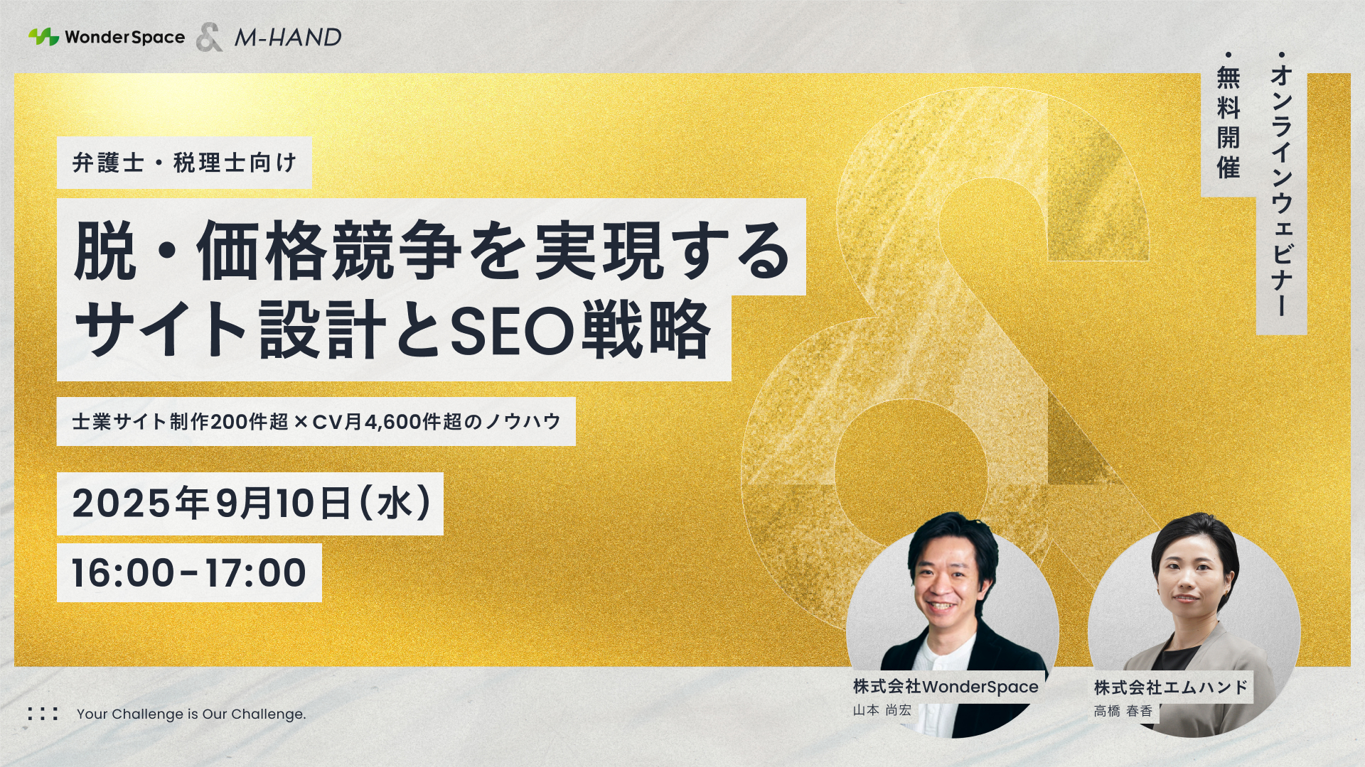 本セミナーでは、SEO対策で月間 4,600件超の問い合わせを生み出す集客ノウハウを持つ株式会社WonderSpaceと、士業に特化したWeb制作で 200件超の制作実績を誇る株式会社エムハンドが共催し「SEO・事例記事を活用した集客施策」と「成果を生むWebサイト構築」を徹底解説いたします。