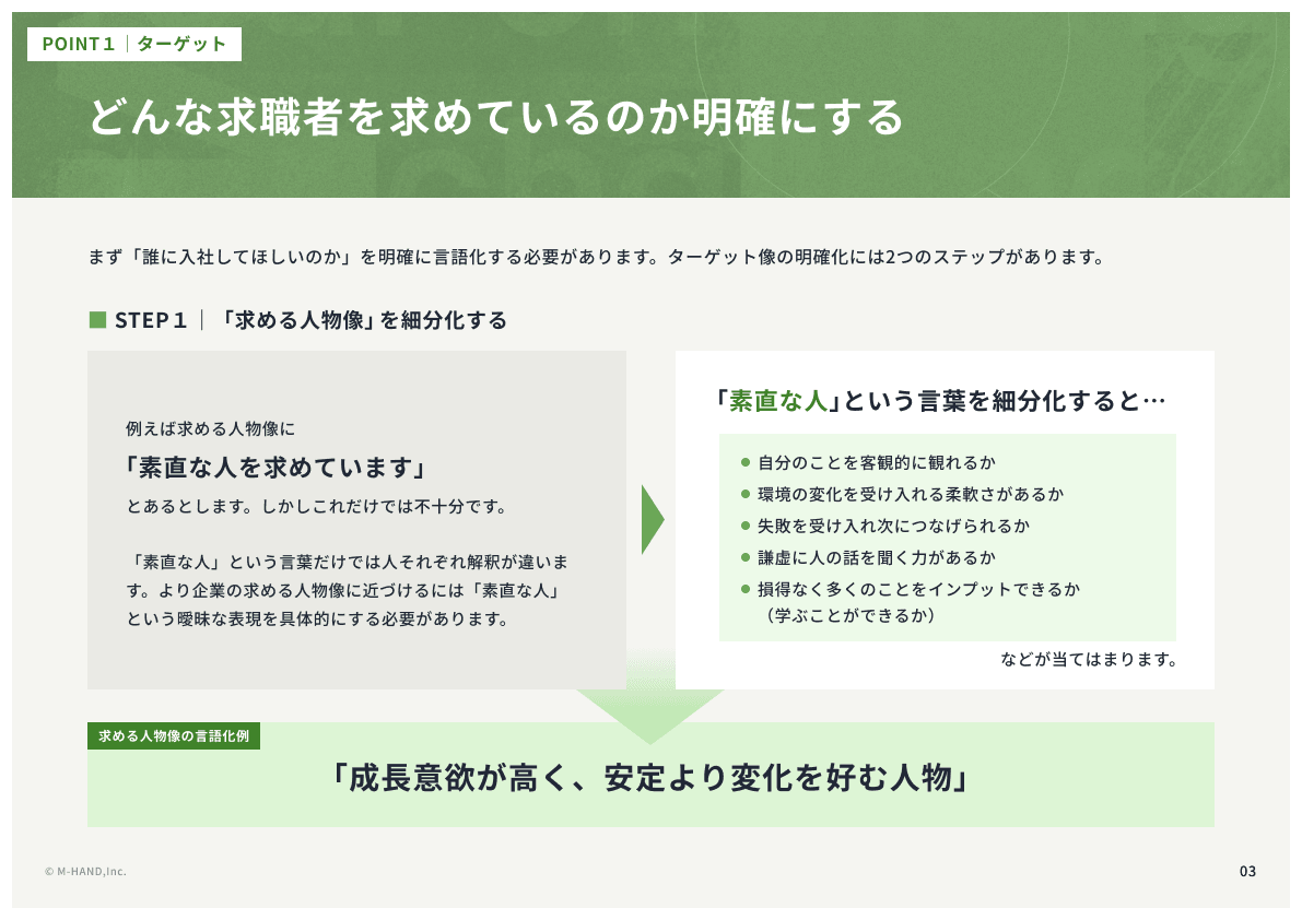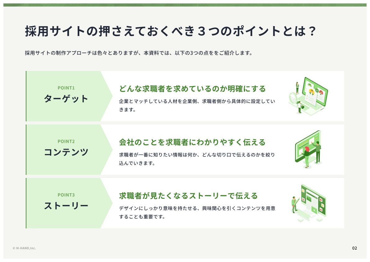 Previous Nextこの資料で得られるもの採用サイトの押さえておくべき3つのポイント会社のことを求職者にわかりやすく伝える切り口求職者が見たくなるストーリーの伝え方本資料では初めて採用サイトを制作される方に向けて、押さえておくべき3つのポイントをご紹介します。※競合企業様や詐称されたアカウントからのご請求の場合はお断りさせていただく場合がございます。会社名必須ご担当者名必須メールアドレス必須検討時期の目安検討時期の目安ホームページの制作・リニューアルを検討中ホームページ制作会社を選定中情報収集段階決まった依頼先があるその他プライバシーポリシーに同意するプライバシーポリシー外部サイトにリンクしますはこちら送信する