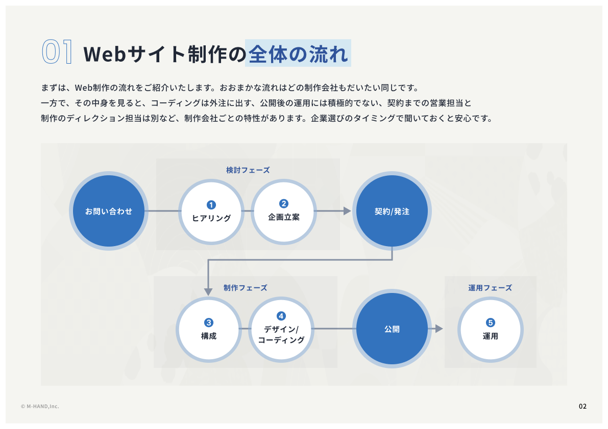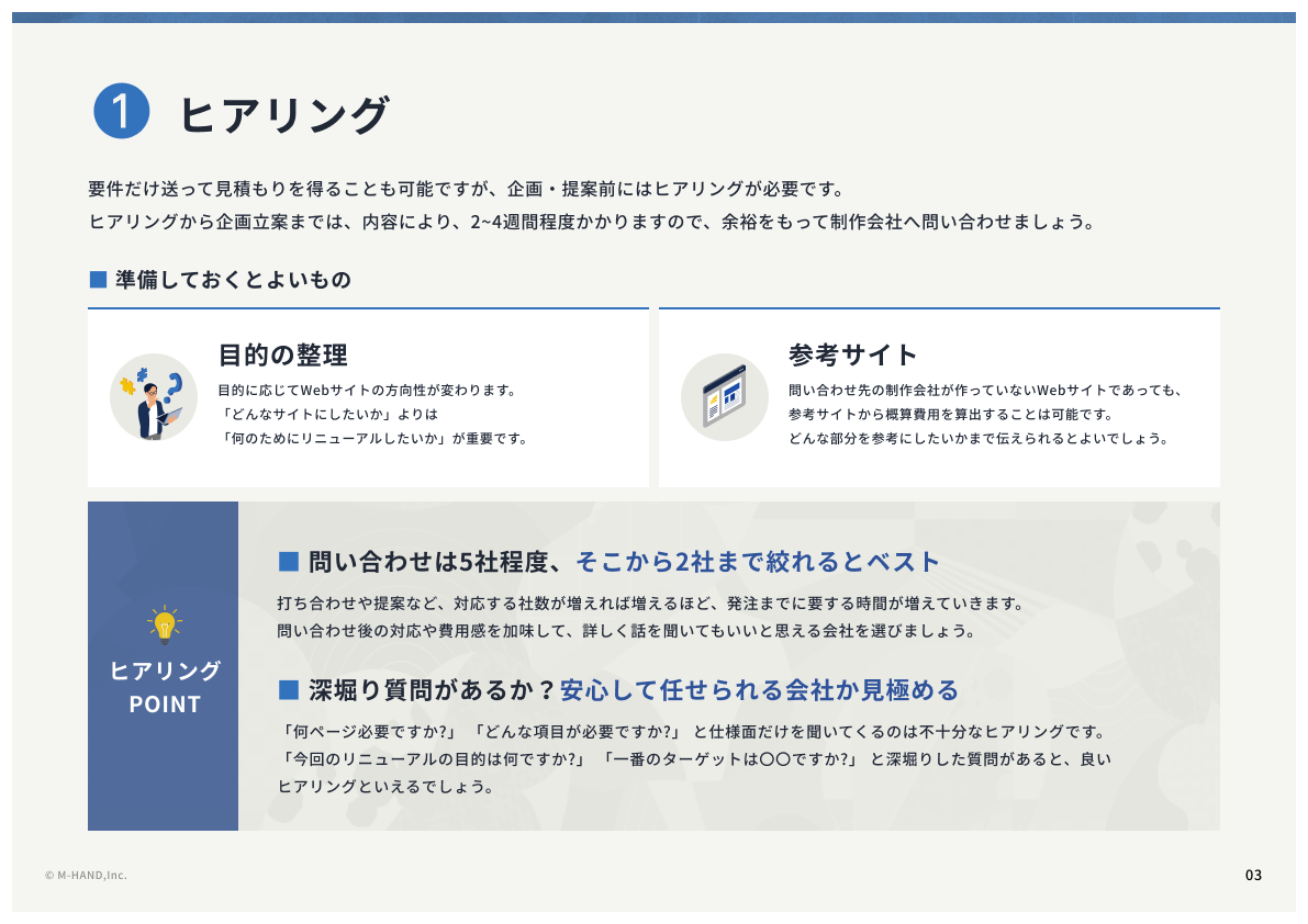Previous Nextこの資料で得られるものお問い合わせから制作後の運用までの流れ制作会社に確認しておくべきポイント発注者側でしておくべき準備本資料では、Web制作会社を選ぶ際、実際に依頼する際に気を付けたいポイントを、制作の流れとQCDSに沿ってご紹介します。初めてのWebサイト制作依頼の手助けになれば幸いです。※競合企業様や詐称されたアカウントからのご請求の場合はお断りさせていただく場合がございます。会社名必須ご担当者名必須メールアドレス必須検討時期の目安検討時期の目安ホームページの制作・リニューアルを検討中ホームページ制作会社を選定中情報収集段階決まった依頼先があるその他プライバシーポリシーに同意するプライバシーポリシー外部サイトにリンクしますはこちら送信する