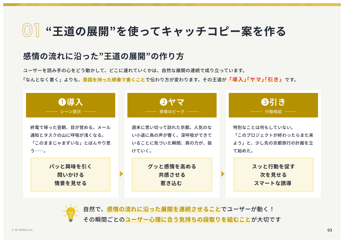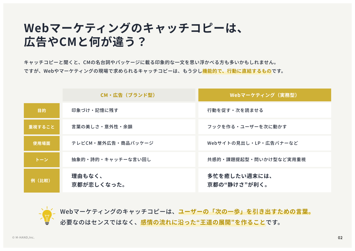 Previous Nextこの資料で得られるものWebマーケティングにおけるキャッチコピー案の作り方ChatGPTで使える生成プロンプトキャッチコピーの品質チェックリストWebやマーケティングの現場で求められるキャッチコピーには、センスや経験は必要ありません。 感情の流れに沿った「王道の展開」でユーザーに次の行動を促すことが大切です。 この資料では、すぐに取り入れられるキャッチコピー案の作り方と仕上げ方をご紹介します。※競合企業様や詐称されたアカウントからのご請求の場合はお断りさせていただく場合がございます。会社名必須ご担当者名必須メールアドレス必須検討時期の目安検討時期の目安ホームページの制作・リニューアルを検討中ホームページ制作会社を選定中情報収集段階決まった依頼先があるその他プライバシーポリシーに同意するプライバシーポリシー外部サイトにリンクしますはこちら送信する