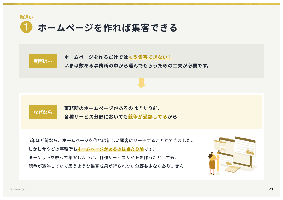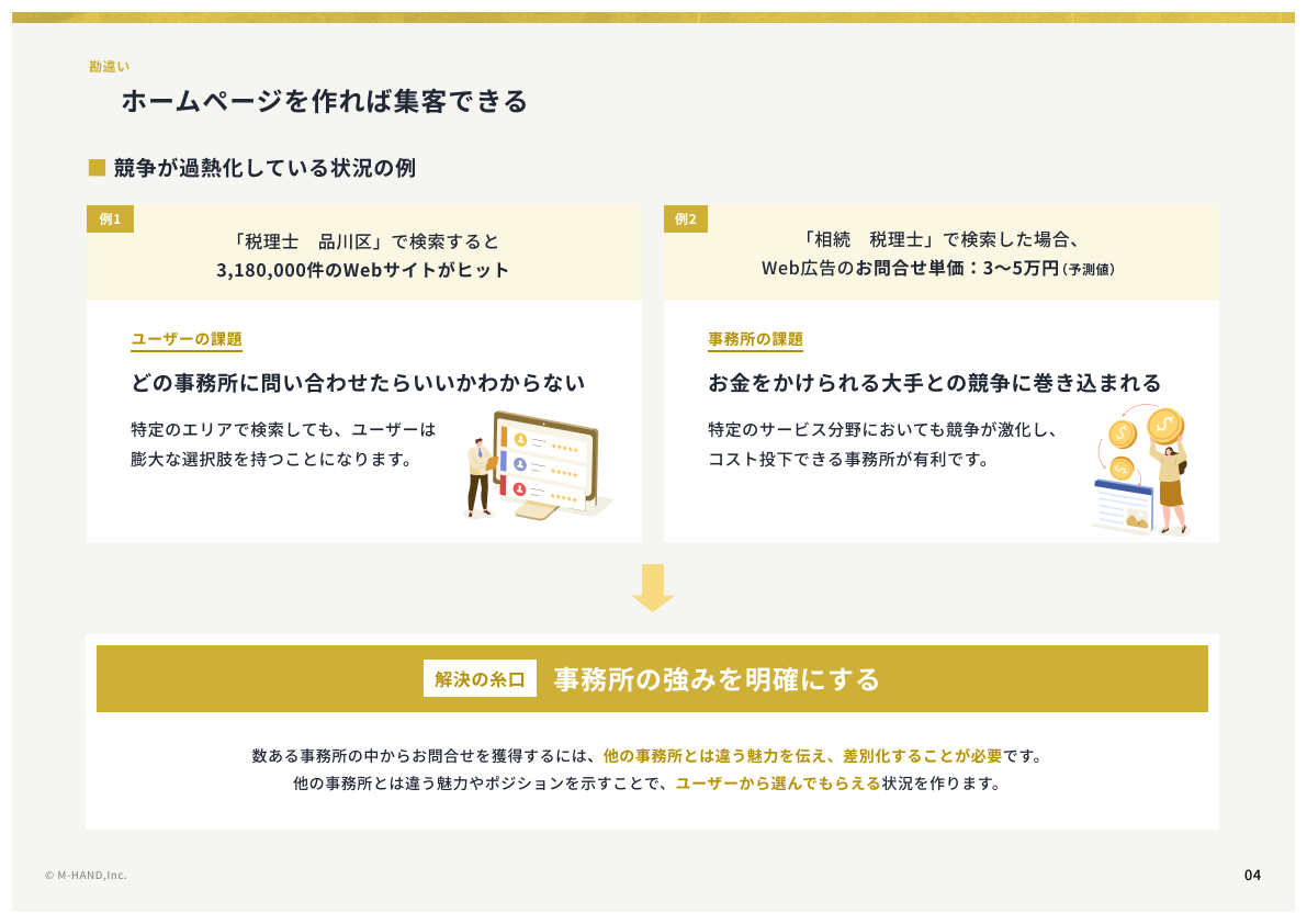 Previous Nextこの資料で得られるもの士業のWeb集客の基本の考え方事務所の強みを明確にする方法本質的なSEO対策のポイント新規顧客獲得のためにWebサイトを作りたい、今あるWebサイトからお問い合わせがこない、そんなお悩みを抱えていませんか? 本資料では、士業専門のWeb制作チームによくご相談いただく内容を例に挙げながら、士業におけるWeb集客の基本を解説します。※競合企業様や詐称されたアカウントからのご請求の場合はお断りさせていただく場合がございます。会社名必須ご担当者名必須メールアドレス必須検討時期の目安検討時期の目安ホームページの制作・リニューアルを検討中ホームページ制作会社を選定中情報収集段階決まった依頼先があるその他プライバシーポリシーに同意するプライバシーポリシー外部サイトにリンクしますはこちら送信する