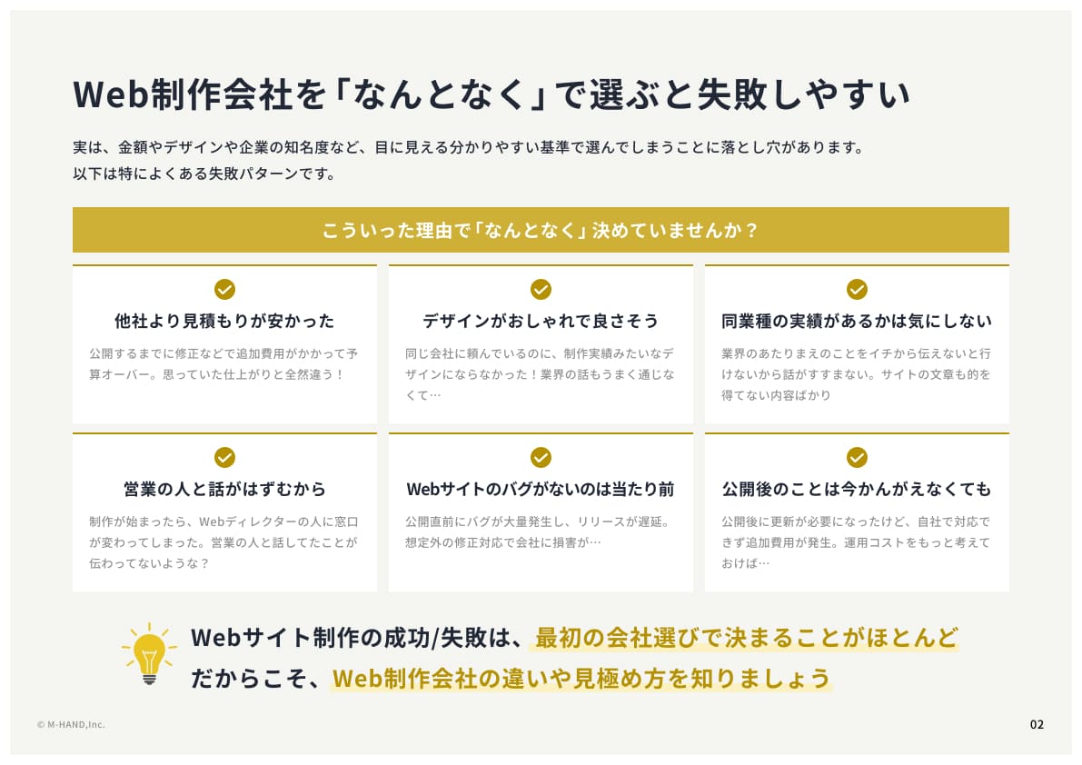 Previous Nextこの資料で得られるものWeb制作会社の違い自分に合った制作会社を見極めるコツ発注・契約で失敗しないためのチェックポイント「デザインが良さそう」「価格が安い」だけで決めると、思った通りのサイトにならないことも…。 大切なのは、“自社に合った” 制作会社を選ぶこと!この資料では、基本的な選び方のポイントをわかりやすく解説し、理想のWebサイトを成功させるヒントをお届けします。※競合企業様や詐称されたアカウントからのご請求の場合はお断りさせていただく場合がございます。会社名必須ご担当者名必須メールアドレス必須検討時期の目安検討時期の目安ホームページの制作・リニューアルを検討中ホームページ制作会社を選定中情報収集段階決まった依頼先があるその他プライバシーポリシーに同意するプライバシーポリシー外部サイトにリンクしますはこちら送信する